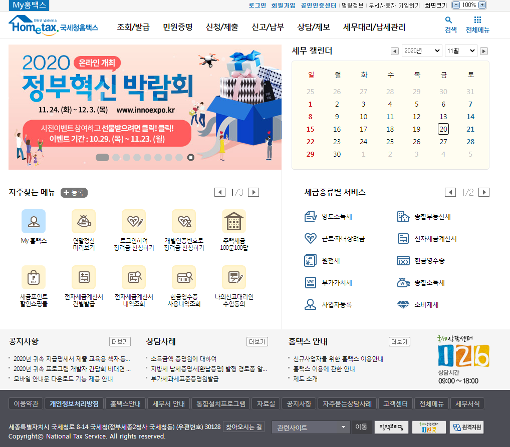관련사이트 바로가기를 통하여 국세 관련 타 서비스(국세청 홈페이지, 국세법령정보, 전국 세무서 찾기, 취업후 학자금 상환 등) 이용 가능. 박재형 국세청 개인납세국장은 이날 브리핑에서 코로나 사태로 어려움을 겪고 있는 개인 사업자 전체에 대해 이번 부가가치세 신고에 한해 신고 기한을 1개월 직권 박재형 국장은 코로나19 감염예방을 위해 세무서 신고창구는 별도 운영하지 않고 국세청 홈텍스 홈페이지( www.hometax.go.kr )나 ars. 국세청 홈텍스 용(개인) 인증서 상세보기. 조회/발급에서 현금영수증>현금영수증 발급수단>소비자발급수단 관리를 클릭합니다. 국세청 홈텍스 용(개인) 인증서 바로 신청하기.